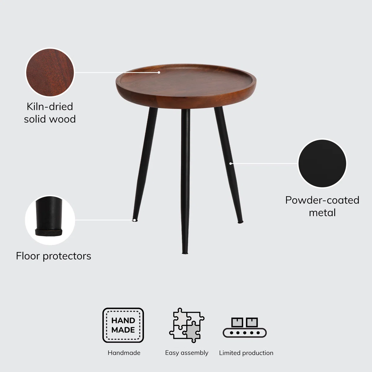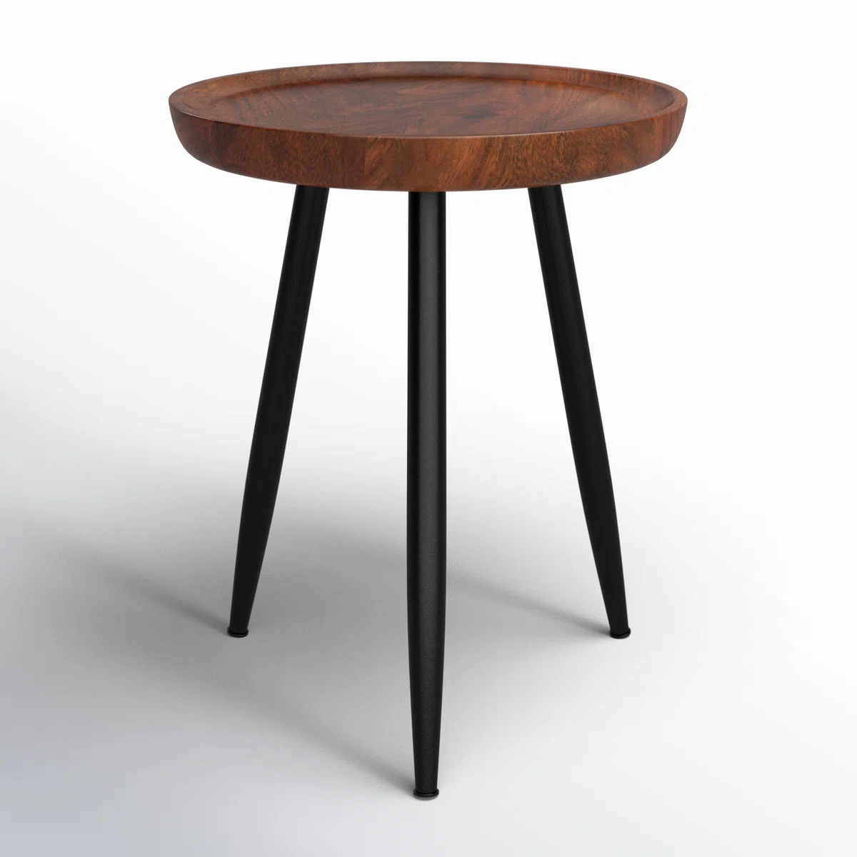 Solid Wood 3-Leg End Table brings a refined natural accent to your space while maintaining compact utility. This Solid Wood 3-Leg End Table features a tray-style circular top made of solid mango wood, showcasing rich grain textures and natural variation. Supported by three tapered iron legs with a powder-coated finish, the design combines rustic warmth with modern minimalism.